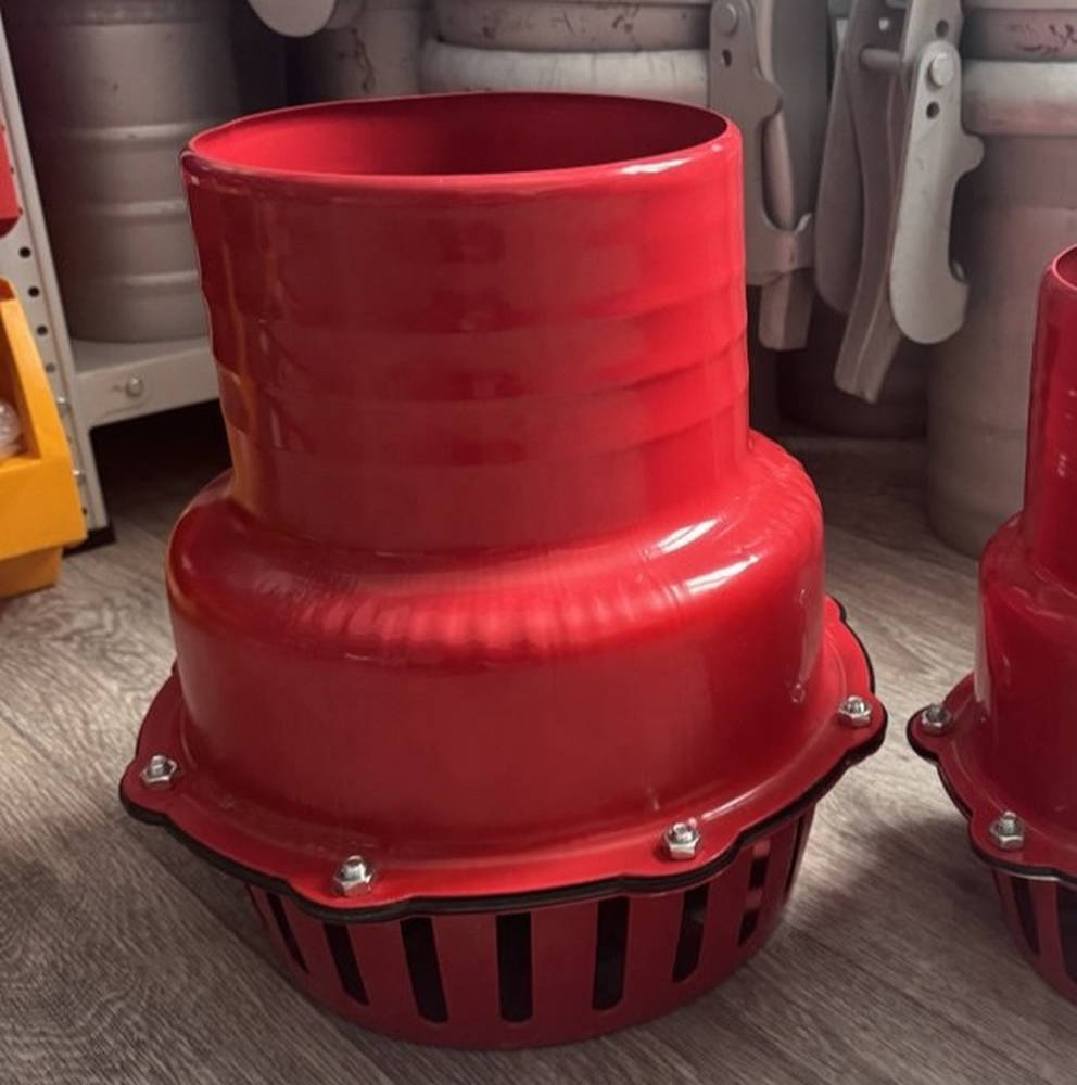 Корпус фильтра типоразмера DN200 выполнен из листовой стали с усиленной перфорированной корзиной, способной выдерживать значительные механические нагрузки и удары о дно водоема. Ярко-красное полимерное покрытие не только защищает металл от коррозии в агрессивной водной среде, но и обеспечивает отличную видимость всасывающей линии d200 (8″), что важно для безопасности проведения работ на промышленных объектах и карьерах.